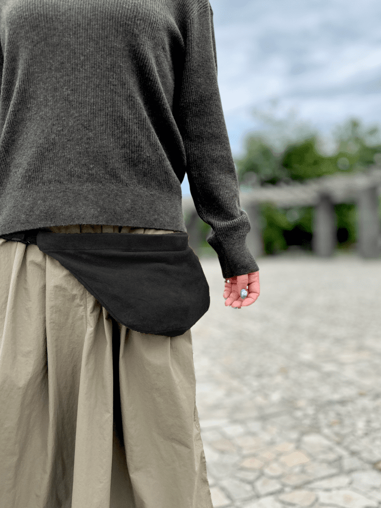 腰に巻けば、荷物の出し入れがスムーズで、動いても中身が暴れません。