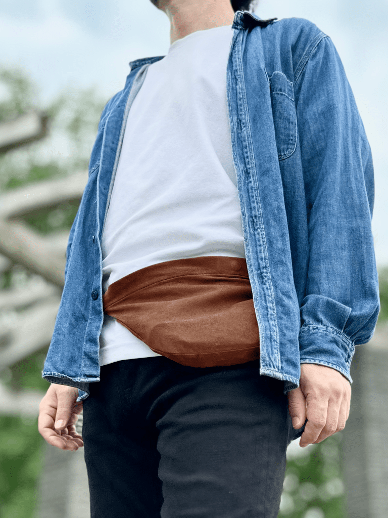 Tシャツにジーンズというラフなスタイルでも、腰に巻いたフィットポーチがあるだけで、ポケットの膨らみを気にせず軽快に動けます。